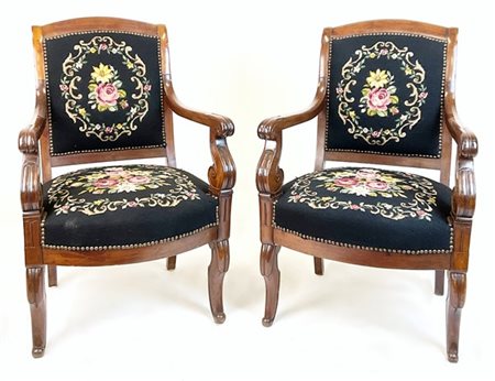 Lot 914 Coppia di poltrone in mogano con braccioli e gambe mosse terminanti a ricciolo, seduta e schienale rivestiti in tessuto a piccolo punto con decoro floreale borchiato. Secolo XIX (difetti)