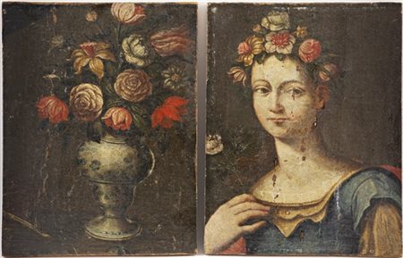 Coppia di antichi dipinti raffiguranti "Flora" e "Vaso fiori"