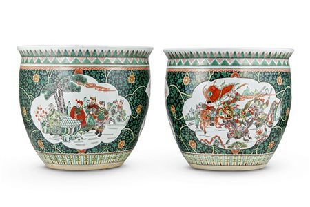 Lot 917 Coppia di cachepot in porcellana Famiglia Verde decorati con scene di battaglia entro riserve