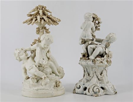 Lot 923 Manifatture venete, secolo XX. Lotto composto da due gruppi in ceramica bianca raffiguranti putti allegorici, marcati sul fondo (h. max cm 28) (difetti, mancanze e restauri)