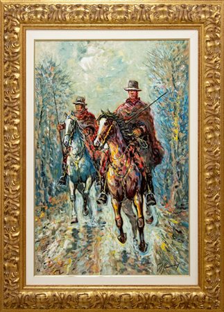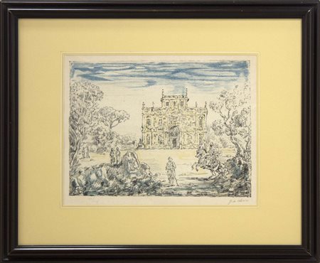 Lot 9 Giorgio De Chirico, Antichi cavalieri e villa, 1954, litografia a 3 colori, cm 35x44, esemplare XXV/XXV, pubblicato in 'Giorgio De Chirico il passato perpetuo opera grafica' a cura di V. Sgarbi, opera senza cornice
