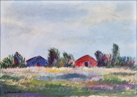 Lot 25 OMICCIOLI GIOVANNI Roma 1901 - 1975 "La capanna a Pratica di Mare" Tecnica mista su cartone spessorato cm 48x34 del 1923. Firmata sul fronte in basso a sinistra. Sul retro firma per autentica del Maestro, titolo e data.