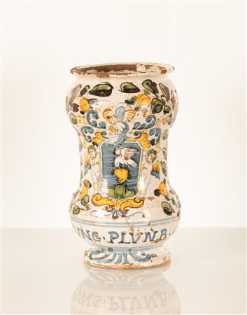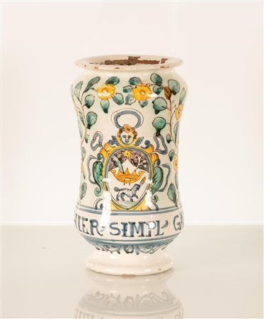 Albarello da farmacia decorato con due serti fioriti stante ad incorniciare un blasone sorretto da due angeli con al centro un'aquila che becca un cuore dorato in cima a tre monti. Manifattura di Torre dei Passeri, fine XVII secolo - primi decenni del XVIII secolo.