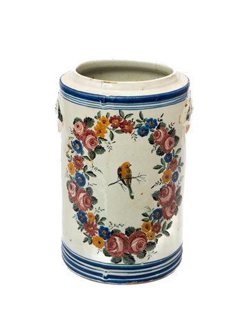 Grande vaso portastrutto senza coperchio con al fronte decoro di uccellino su ramo racchiuso in una ghirlanda floreale e al retro serto fiorito