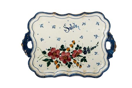 Vassoio mistilineo con bordi blu, prese a conchiglia, decorato con serto fiorito, mazzetti di fiori stilizzati e la scritta "SALUTE"