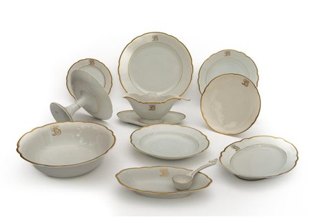 Servito da tavola in porcellana bianca con orlo mistilineo bordata d'oro con iniziali "DS" della ditta S.I.M.A.C. di Castelli