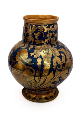 Vaso a boccia in maiolica a lustro metallico con cornucopia e riche girali fogliati in oro di gusto neorinascimentale su fondo a blu cammeo