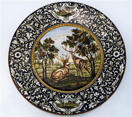 Grande piatto R. Troisi Castelli con girali e paesaggi alla tesa e coppia di cervi