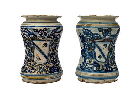 Coppia di albarelli da farmacia raffiguranti “Stemmi”. Manifattura di Laterza XVII secolo