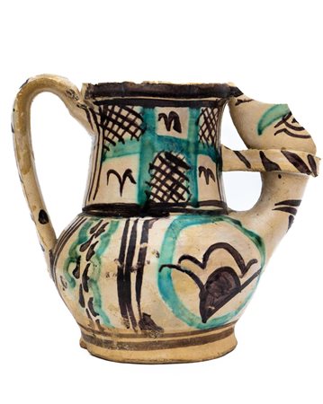 Versatoio in maiolica arcaica con becco carenato, ansa a nastro, decorato a zaffera in verde ramina con elementi fitomorfi trilobati e a graticcio