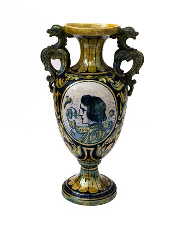 Centrotavola decorato a lustro metallico biansato con anse draghiformi, coppia di medaglioni - al fronte e al retro - centrati dai ritratti di due personaggi recanti i cartigli "Alina" e"Armando "