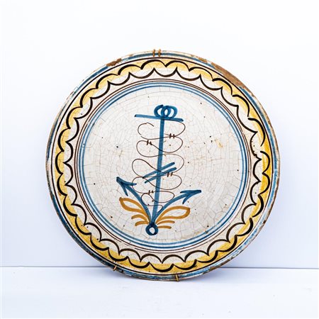 Grande piatto in maiolica con decoro a treccia in manganese sulla tesa e disegno stilizzato di un'ancora in azzurro e arancio nel cavo