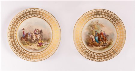 Coppia di piatti in porcellana con decori in oro di gusto secondo ottocento sulla tesa e con al cavetto dipinte scene di caccia. Sevres, fine del XIX inizi - del XX secolo