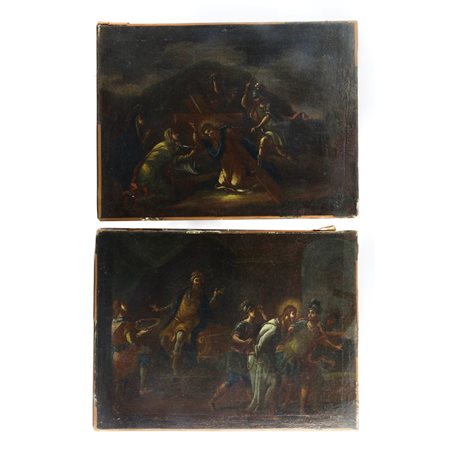 dipinti ad olio su tela raffiguranti: Ponzio Pilato che si lava le mani; caduta di Gesù.