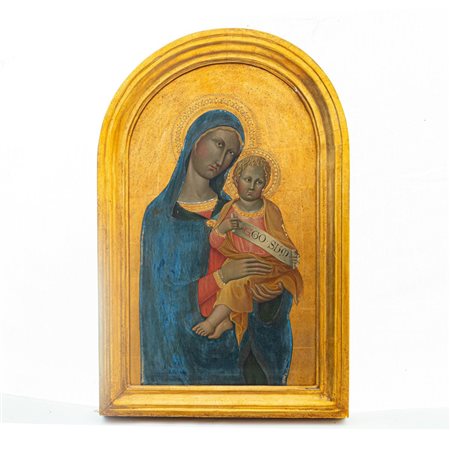 dipinto a tempera su tavola 50 x 30 cm in policromia su fondo oro, ripresa dalla tradizione del '300 italiano entro cornice dorata -