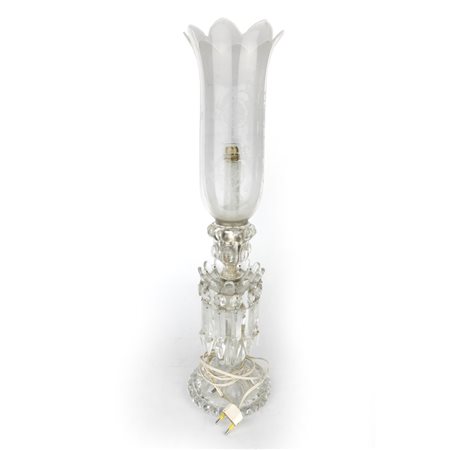 elettrificata, in vetro, con campana lavorata alla mola a motivi floreali e pendenti a prisma.