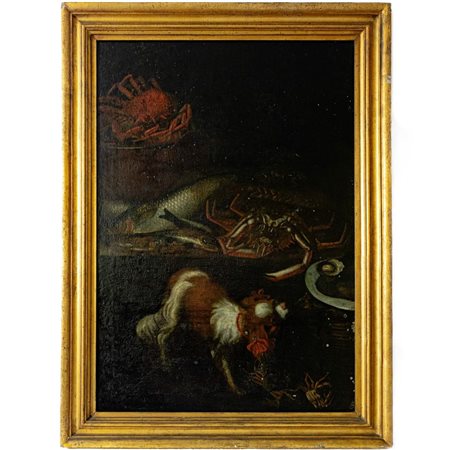 Pittore napoletano, natura morta composizione con crostacei e cagnolino fine XVII inizio XVIII secolo