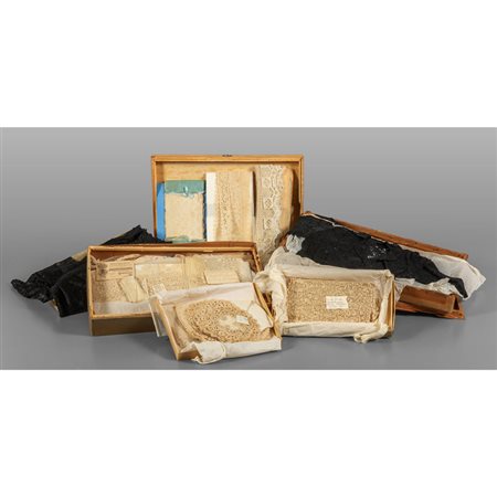 Lot 0876 Sei scatole contenente pizzi di varie epoche