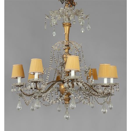 Lot 0877 Lampadario Luigi XVI a otto luci in legno intagliato e dorato con ricca decorazione in cristalli Genova fine sec.XVIII