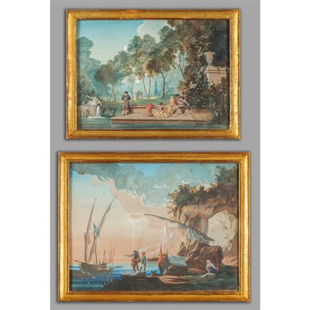Lot 0874 Scuola emiliana sec.XVIII 'Paesaggi animati con figure' coppia di tempere