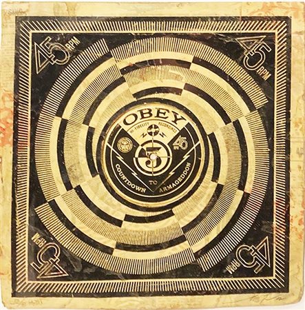 Lot 15 Shepard Fairey - Obey, Collage con serigrafia e tecnica mista su carta, 12,5x12,5 cm, HPM, 2012; Ed. 8/8; Sul retro timbro Archivio Verisart
