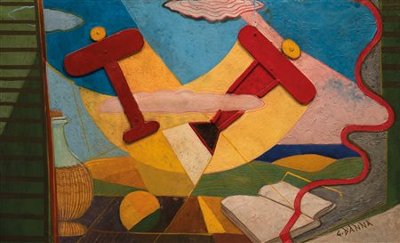 Lot 3 Giulio D’Anna (Villarosa 1908 - Messina 1978) Natura morta + aerei Caproni, 1933/34;Polimaterico su tavola, 41 x 66 cm