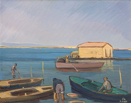 Lot 7 Antonio Mura (1902 - 1972) Marina con pescatori, anni ‘30;Olio su compensato, 40 x 50 cm