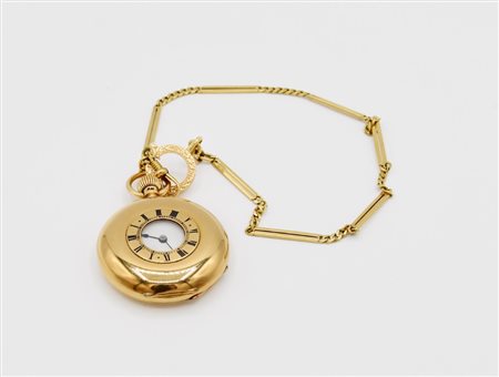 Cassa savonette ad occhio di bue in oro 18k punzonata Liverpool 1895-1896, quadrante in smalto bianco con numeri romani con doppia lancetta delle ore a forcella, con catena in oro 750, carica a remontoir.