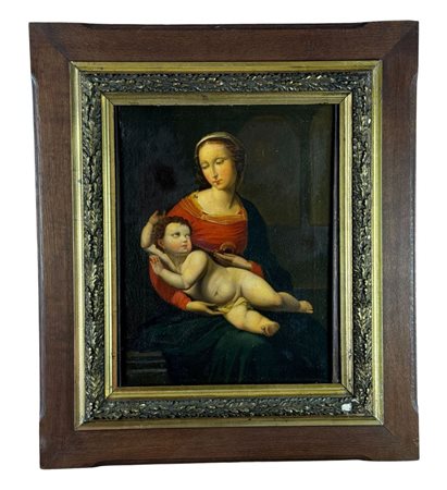 Lot 6 Dipinto olio su tela, periodo inizio XIX secolo, scuola Italiana, raffigurante Madonna con Bambino da Raffaello Sanzio. Dimensioni compreso cornice: 66x76 cm. Dimensioni interno cornice: 37,5x49,5. Da artista anonimo. Opera in buone condizioni con lievi segni di vissuto, con piccoli punti di restauro come da foto allegate.