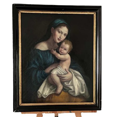 Lot 10 Dipinto olio su tela, Scuola Francese XIX/XX secolo, raffigurante Madonna col Bambino.