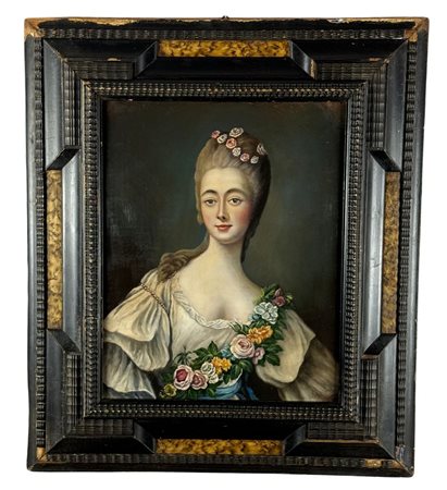 Lot 11 Dipinto olio su tela esuccessivamente applicata su pannello, periodo XIX/XX secolo scuola Italiana, raffigurante Contessa Du Barry da Jeanne Bécu 1743 - 1793 . Dimensioni compreso cornice: 64x75 cm. Dimensioni interno cornice: 40x50 cm. Da artista anonimo. Opera in buone condizioni e di eccellente qualità artistica. Cornice da restaurare.