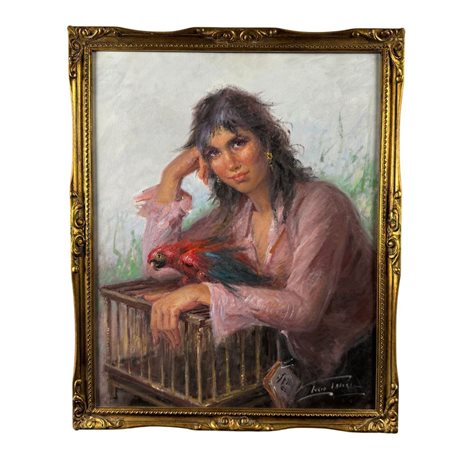 Lot 12 Dipinto olio su pannello, periodo XX secolo scuola Italiana, raffigurante Ragazza con gabbietta e pappagallo. Dimensioni interno cornice: 40x50 cm, dimensioni compreso cornice: 45x55 cm. Firma in basso a destra da Lucio Tafuri (1941). Opera in buone condizioni.