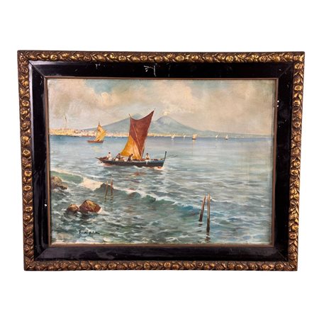 Lot 16 Dipinto olio su tela, periodo XX secolo scuola Italiana, raffigurante Golfo di Napoli. Dimensioni interno cornice: 54x40 cm. Dimensioni compreso cornice: 67x53 cm. Reca firma in basso a sinistra da Fausto Pratella (1888). Opera in buone condizioni con lievi segni di vissuto come da foto allegate.