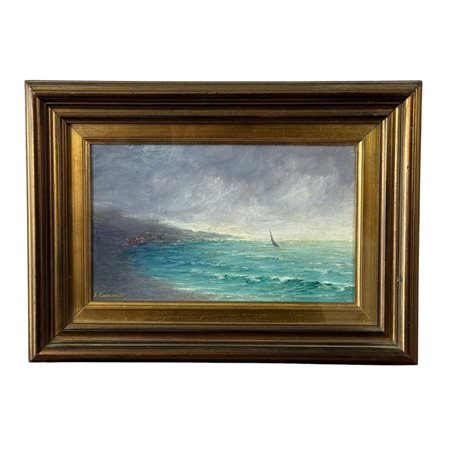 Lot 18 Dipinto olio su tela, periodo XX secolo scuola Italiana, raffigurante Scorcio di costiera. Dimensioni compreso cornice: 60,5x74 cm. Dimensioni interno cornice: 45x54 cm. Reca firma in basso a destra da Luigi Crisconio. Opera in buone condizioni.