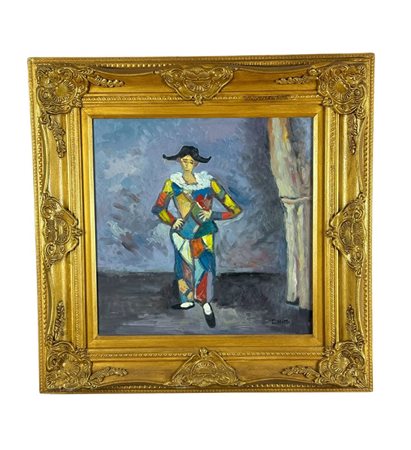 Lot 19 Dipinto olio su tavola, periodo XX secolo scuola Italiana, raffigurante Arlecchino. Dimensioni compreso cornice: 60x60 cm. Dimensioni interno cornice: 40x40 cm. Reca firma in basso a destra da "E. Notte". Opera in buone condizioni.