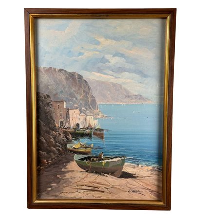Lot 22 Dipinto olio su tela, periodo XX secolo scuola italiana, raffigurante Marina partenopea. Dimensioni compreso cornice: 55x75 cm. Dimensioni interno cornice: 50x70 cm. Reca firma in basso a destra da L. Savarese. Opera in buone condizioni.