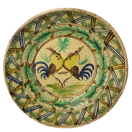 Lot 1 Piatto di Caltagirone in ceramica decorata e smaltata policroma con raffigurazione di coppia di galli, Fine 19° secolo h cm 11 diametro cm 57