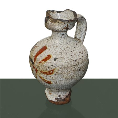 Lot 14 Orciolo con manico in maiolica di Caltagirone invetriata decorata e smaltata policroma in pasta bianca, 18° / 19° secolo h cm 14