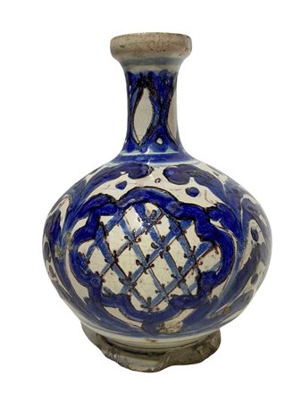 Lot 16 Officine Maiolicane Caltagironesi - Bottiglia, 18° secolo h 23 cm Maiolica Fondo bianco con ramage a larghe foglie che inquadrano fiori di gelsomino in blu