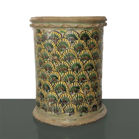 Lot 17 Grande Cilindro decorato a coda di pavone , Caltagirone 1802. H cm 36, larghezza 30. Restauri. Grande Cilindro decorato a coda di pavone , Caltagirone 1802. H cm 36, larghezza 30. Restauri al fondo.