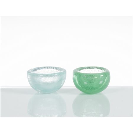 Due coppe in vetro sommerso, una a bollicine verde e una a mezza filigrana acquamarina, corpo semisferico con bocca circolare. Firmata all'acido sotto la base "Venini Murano".