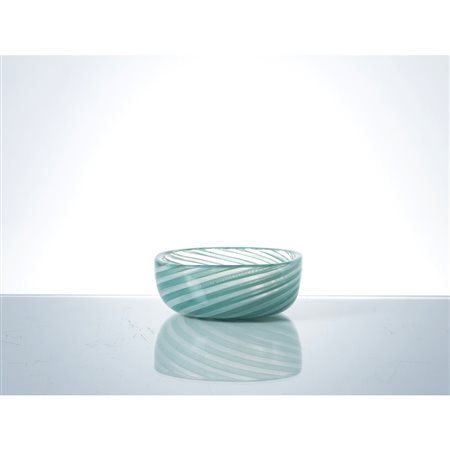 Coppa in vetro soffiato zanfirico a canne diagonali a rete lattimo e verde, corpo semisferico schiacciato con bocca quadrangolare piana. Firma all'acido sotto la base "Venini Murano”.