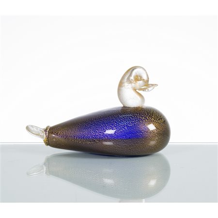 Figura di anatra in vetro sommerso blu con inclusioni oro, collo, testa e coda in vetro incolore con inclusioni oro. Etichetta di produzione.