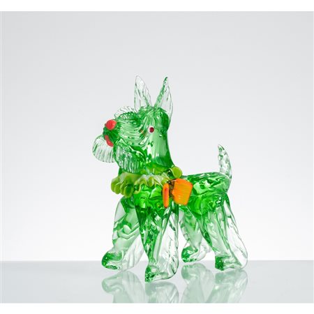 Figura di cane terrier in vetro verde, particolari in vetro rosso e arancione.