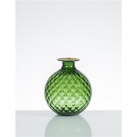 Vaso solifleur “Balloton” in vetro soffiato nei toni del verde con perfilo rubino sulla bocca, corpo globulare con basso collo e bocca circolare lievemente estroflessa. Etichetta di produzione e firma alla base “Venini Italia 2010”.