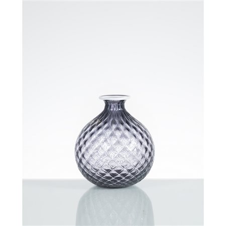 Vaso solifleur “Balloton” in vetro soffiato nei toni del prugna con perfilo sulla bocca lattimo, corpo globulare con basso collo e bocca circolare lievemente estroflessa. Etichetta di produzione e firma alla base “Venini Italia 1983”.