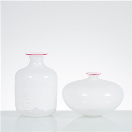 Due vasi in vetro incolore a filigrana lattima di forma differente, uno cilindrico e uno sferico, stretto collo con bocca circolare piana e decorata con bordo rubino.