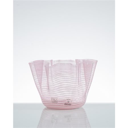Vaso modello “Fazzoletto” in vetro soffiato rosa con filigrane lattime. Etichetta di produzione.
