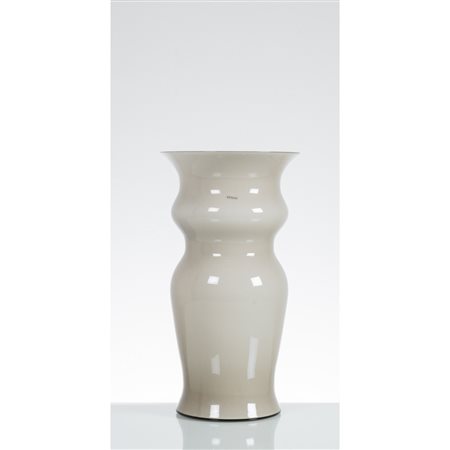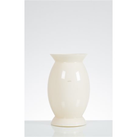 Vaso modello “Idalion” in vetro opalino avorio, corpo ovalizzato, collo lievemente strombato con bocca circolare piana. Etichetta di produzione e firma a graffio Venini 2004.