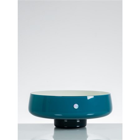 Centrotavola commemorativo in vetro incamiciato blu Ottanio e vaniglia, corpo circolare, base in vetro nero. Etichetta di produzione e firma a graffio “Venini per Chiquita natale 2002”